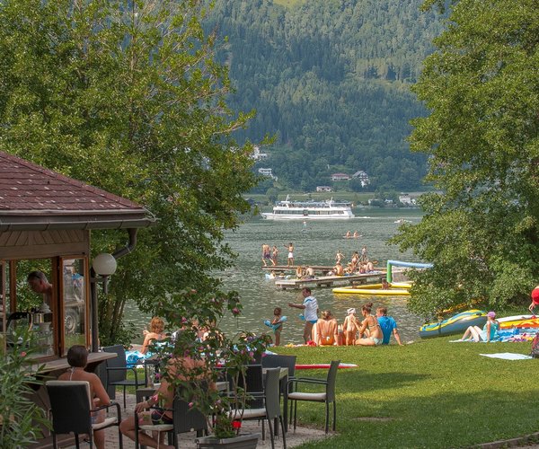 Ein kühles Getränk, eine Eistüte, ein kleiner Snack und dazu ein unvergleichlicher Blick auf die schimmernden Wellen des Ossiacher Sees – so lässt sich’s leben.